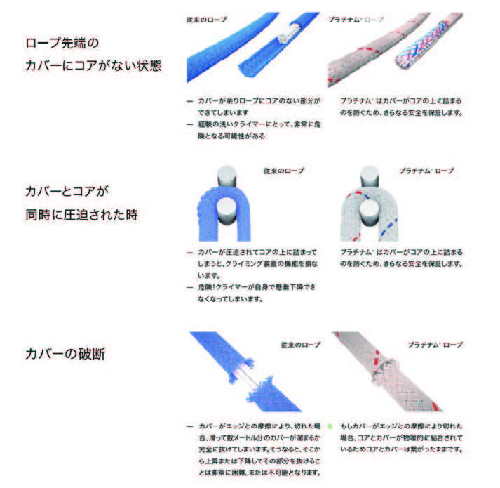 コアとカバーは一定間隔で物理的に連結されており、連結糸の方向を変えることでねじれを抑え、特に長距離の懸垂下降時に安定性を発揮します。